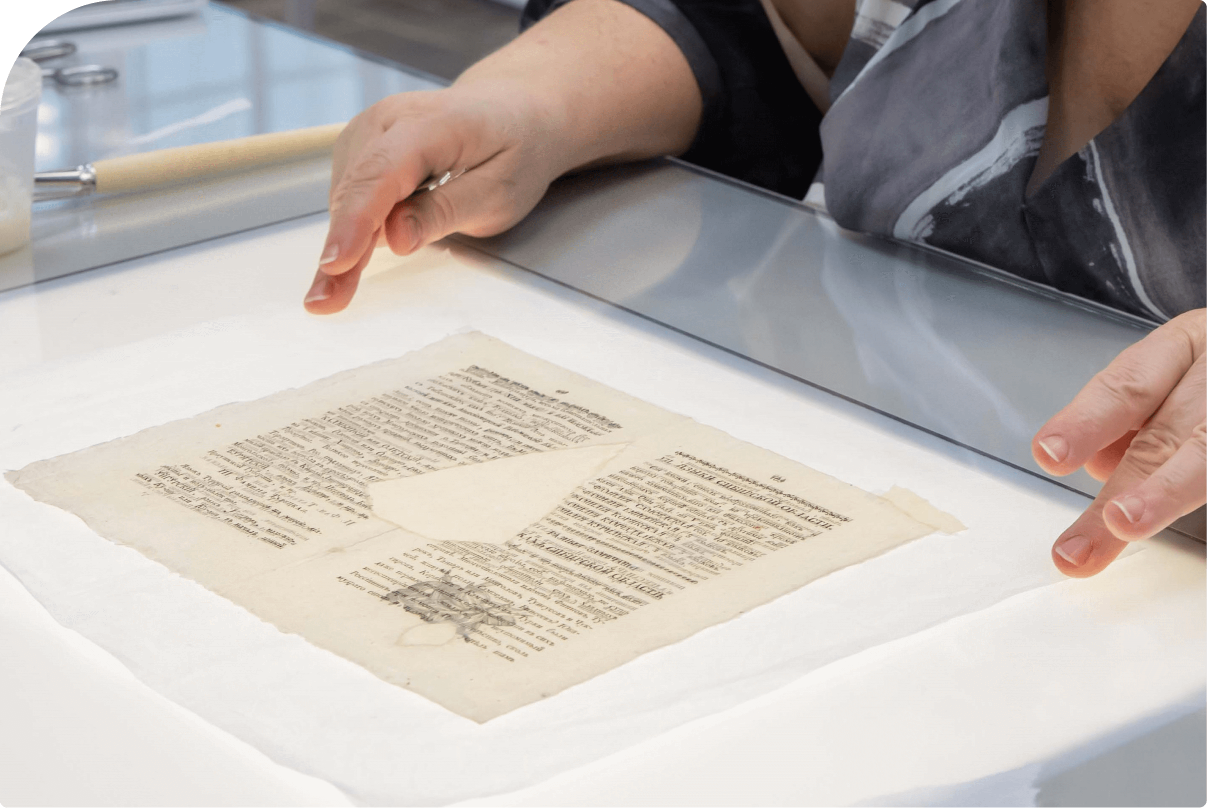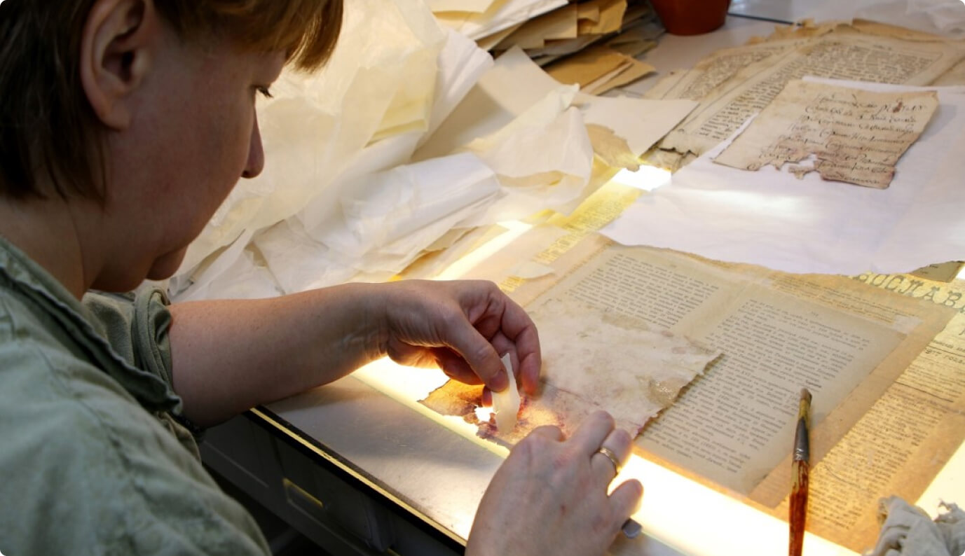Реставрация фондов (воссоздание первоначальной формы и внешнего вида документа, очистка и упрочение; эстетика, принципы, способы реставрации; реставрационные материалы, инструменты, оборудование, паспорта и паспорта сохранности)